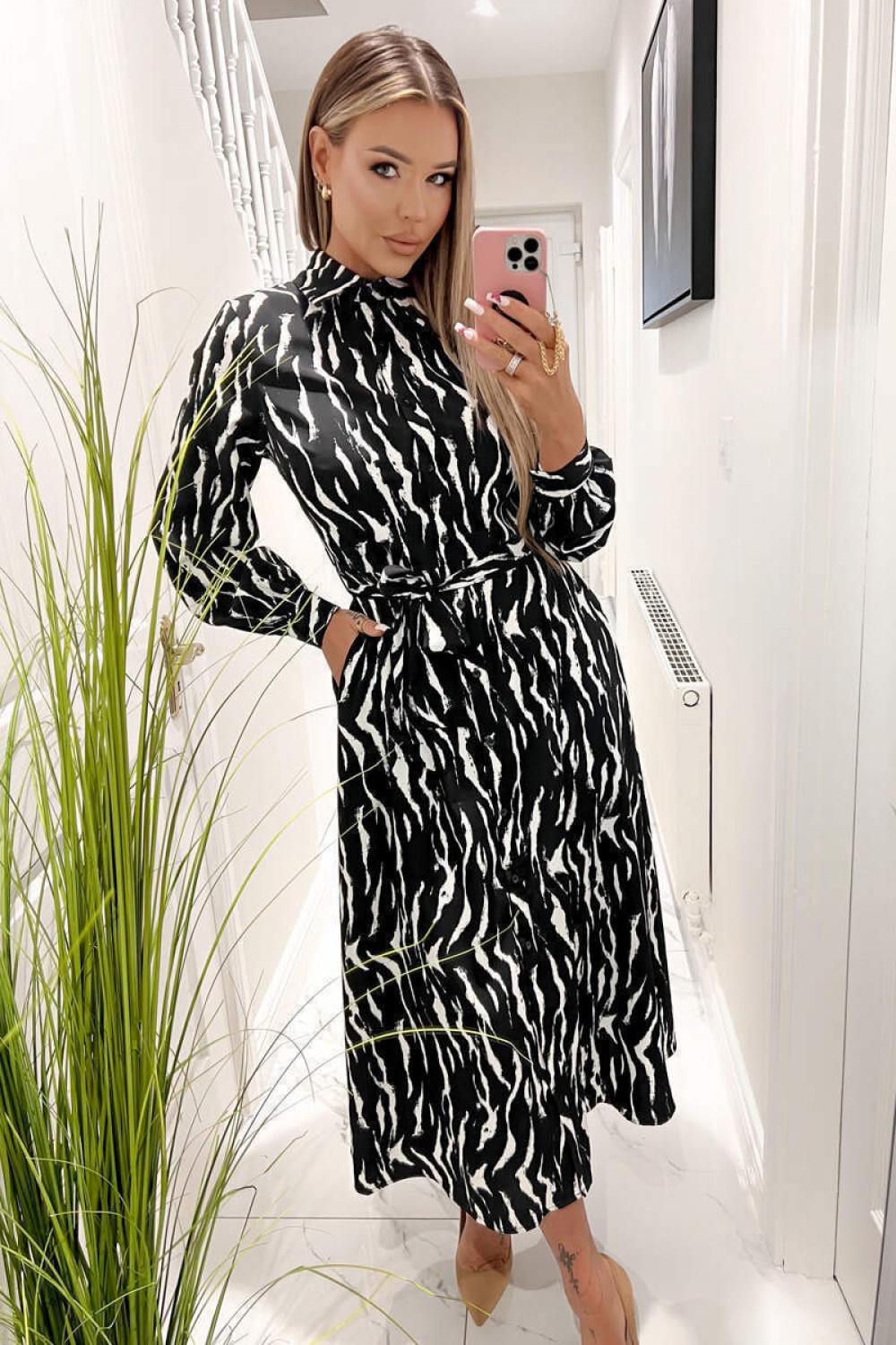 Black And White Printed Button Up Midi Shirt Dress